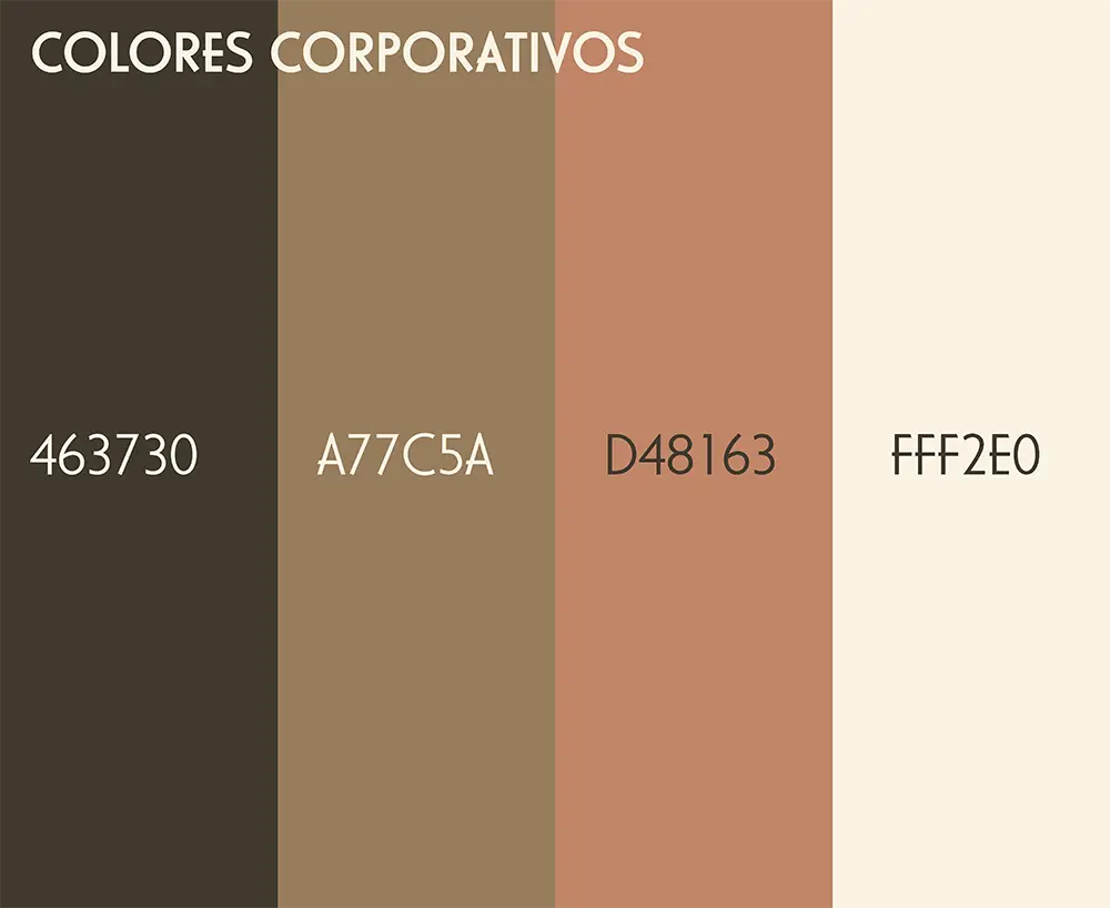 Los colores escogidos están relacionados con la idea principal de lo rural, de esta forma hemos escogido colores terrosos y ocres como colores corporativos, siendo estos colores más cálidos y hogareños en sus combinaciones y al ser usados en el estilo fotográfico dan esa sensación de estar en casa de tus abuelos.